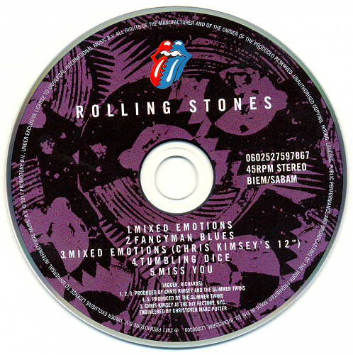 Japan, Rolling Stones Records / Polydor UICY-5011/55 CD27 - #0602527597867 Mixed Emotions (1989) 27-1 Mixed Emotions 4:04 27-2 Fancyman Blues 4:55 27-3 Mixed Emotions (Chris Kimsey's 12") 6:14 27-4 Tumbling Dice 3:45 27-5 Miss You 3:37 https://www.covrik.com/covers/201502...27front_rs.png https://www.covrik.com/covers/201502...c27back_rs.png https://www.covrik.com/covers/201502...isc27cd_rs.png https://www.covrik.com/covers/201502...atrix27_rs.png |
