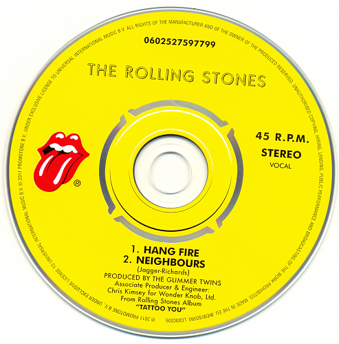 Japan, Rolling Stones Records / Polydor UICY-5011/55 CD19 - #0602527597799 Hang Fire / Neighbours (1981) 19-1 Hang Fire 2:24 19-2 Neighbours 3:32 https://www.covrik.com/covers/201502...19front_rs.png https://www.covrik.com/covers/201502...c19back_rs.png https://www.covrik.com/covers/201502...isc19cd_rs.png https://www.covrik.com/covers/201502...atrix19_rs.png |