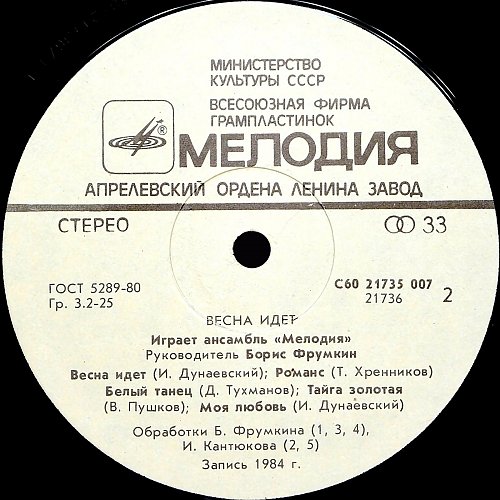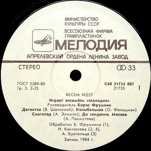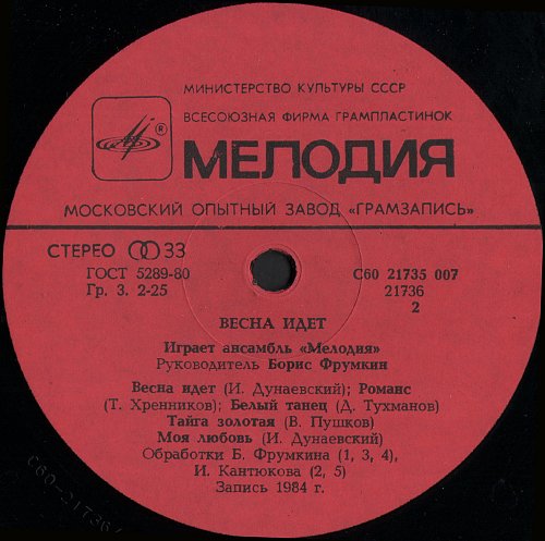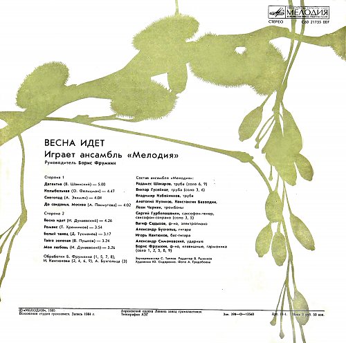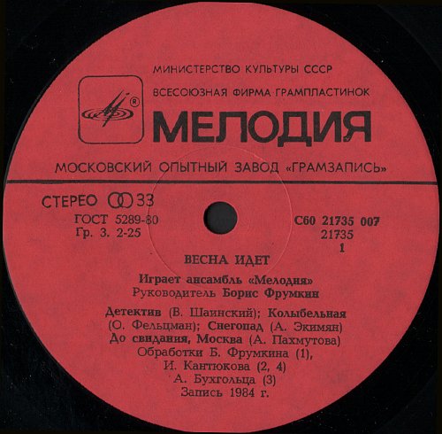 С60 21735 007 Запись 1984 год. 1985 год. Апрелевский завод грампластинок Сторона 1 01. Детектив (В Шаинский) 02. Колыбельная (О. Фельцман) 03 Снегопад (А. Экимян) 04. До свидания, Москва (А. Пахмутова) Сторона 2 05. Весна идет (И. Дунаевский) 06. Романс (Т. Хренников) 07. Белый танец (Д. Тухманов) 08. Тайга золотая (В. Пушков) 09. Моя любовь (И. Дунаевский) Обработки А. Бухгольца (3), И. Кантюкова (2, 4, 6, 9), Б. Фрумкина (1, 5, 7, 8) ![]() ![]() ![]()