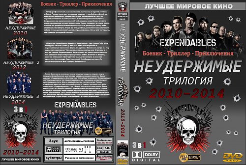 1. Неудержимые / The Expendables (2010) США, режиссер Сильвестр Сталлоне 2. Неудержимые 2 / The Expendables 2 (2012) США, режиссер: Саймон Уэст 3. Неудержимые 3 / The Expendables 3 (2014) США, Франция, Болгария, режиссер Патрик Хьюз https://www.covrik.com/covers/202303...vdcover_rs.jpg |