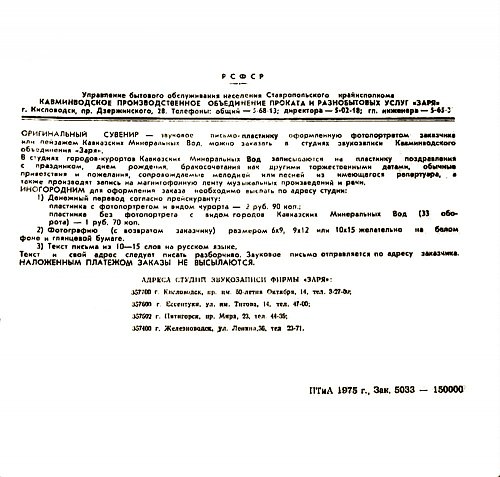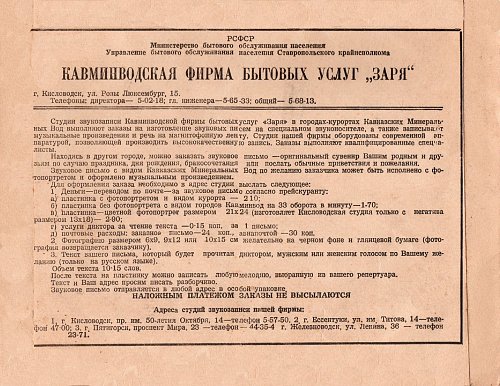 Железноводская студия звукозаписи. Ставропольское краевое управление бытового обслуживания "Горпромбыткомбинат".