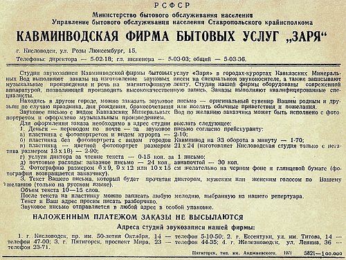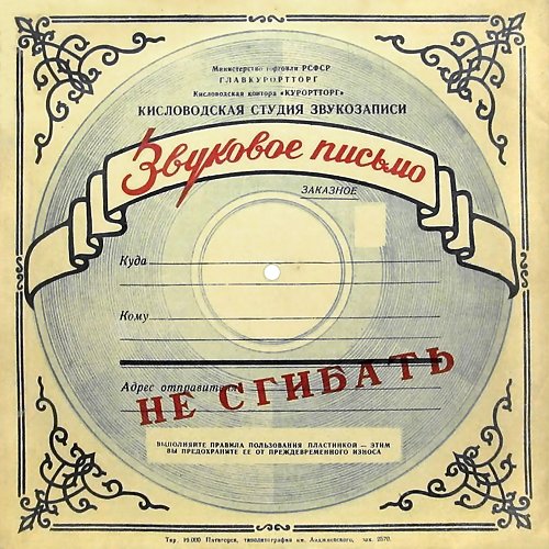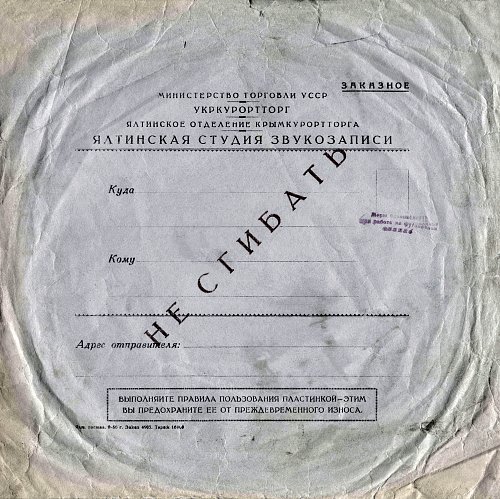 УКРКУРОРТТОРГ ЯЛТИНСКОЕ ОТДЕЛЕНИЕ КРЫМКУРОРТТОРГА ЯЛТИНСКАЯ СТУДИЯ ЗВУКОЗАПИСИ НЕ СГИБАТЬ ВЫПОЛНЯЙТЕ ПРАВИЛА ПОЛЬЗОВАНИЯ ПЛАСТИНКОЙ — ЭТИМ ВЫ ПРЕДОХРАНИТЕ ЕЕ ОТ ПРЕЖДЕВРЕМЕННОГО ИЗНОСА. Ялт. гостин. 9-56 г. Заказ 4905. Тираж 16000 «Звуковой сувенир» — фотокарточка с грамзаписью. Их изготавливали в присутствии заказчика маленькие полукустарные студии звукозаписи в курортных городах СССР (Википедия https://ru.wikipedia.org/wiki/%D0%93...BD%D0%BA%D0%B0). https://www.covrik.com/covers/202001...apisi01_rs.jpg |